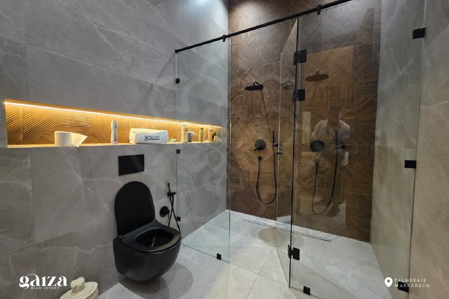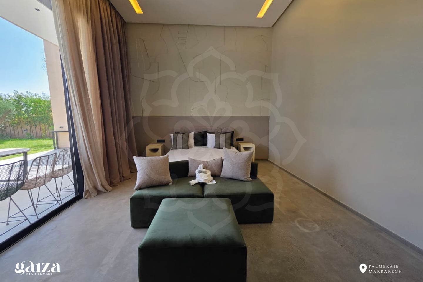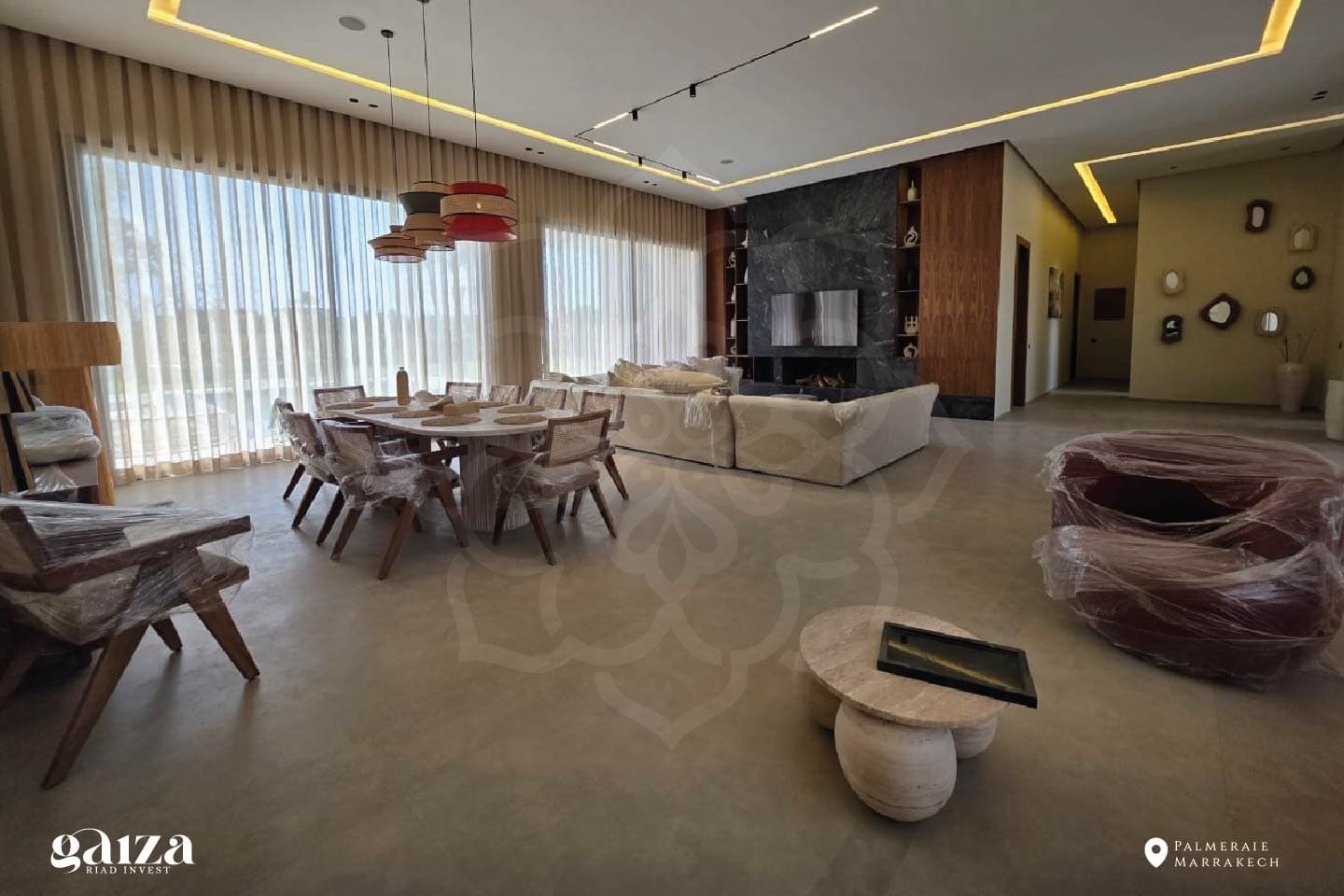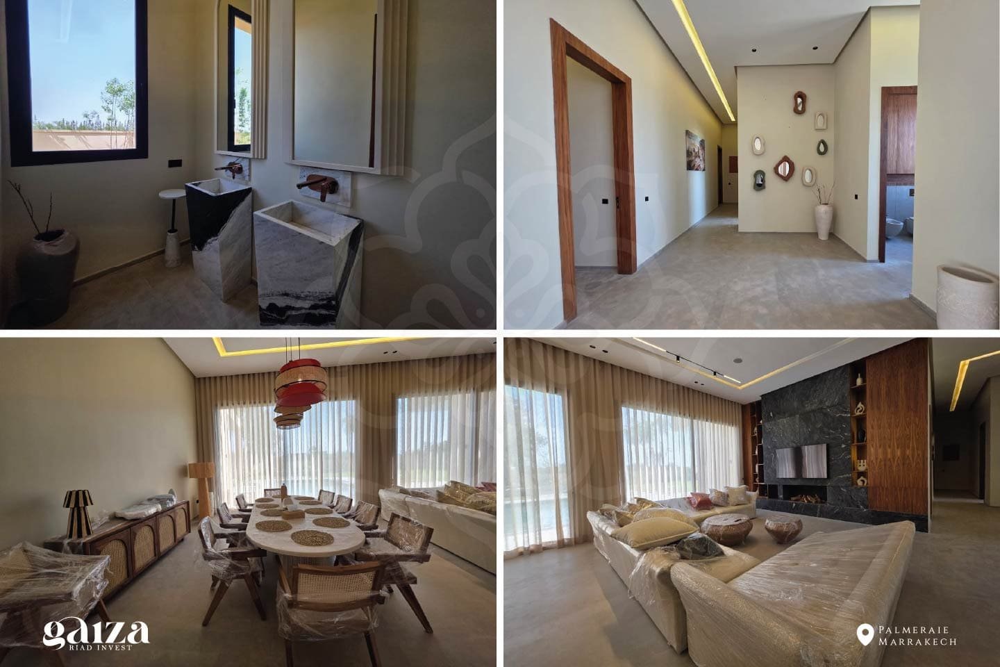 À quelques minutes du centre de Marrakech, cette villa contemporaine de plain-pied, située au kilomètre 12 de la Route de l’Ourika, déploie son architecture élégante au cœur d’un paysage d’exception. Sur un terrain paysager de 1 640 m², la propriété offre 380 m² habitables où le design, la lumière et le confort se conjuguent avec harmonie.
